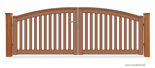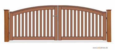 Gartentor BRIDGE - Alle ONLY® Gartentore werden aus dauerhaftem Mahagoni Holz und aus nordischer Lärche gefertigt. Die Rahmen bestehen aus 45 x 100 mm - die gezapften Leisten sind 25 x 56 mm stark. Das optional erhältliche Zubehör ist komplett aus rostfreiem V2A - Edelstahl gefertig.