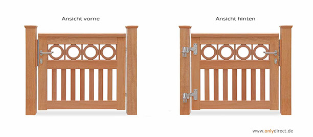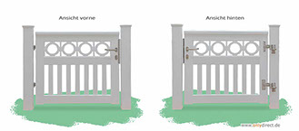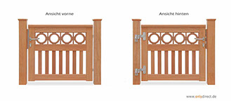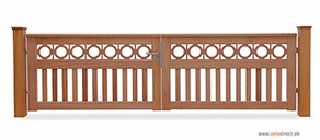 Das Gartentor ZERO weist eine sehr schöne, kreisförmige Ornamentfräsung im oberen Bereich des Gartentores auf. Im Zusammenspiel mit dem formschönem Satteldach ergibt sich eine dezent elegante Wirkung. Die stilvolle Pfostenabdeckung “Spitze” harmoniert sehr schön mit der Formgebung des Satteldaches.