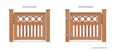 Das Gartentor ZERO weist eine sehr schöne, kreisförmige Ornamentfräsung im oberen Bereich des Gartentores auf. Im Zusammenspiel mit dem formschönem Satteldach ergibt sich eine dezent elegante Wirkung. Die stilvolle Pfostenabdeckung “Spitze” harmoniert sehr schön mit der Formgebung des Satteldaches.